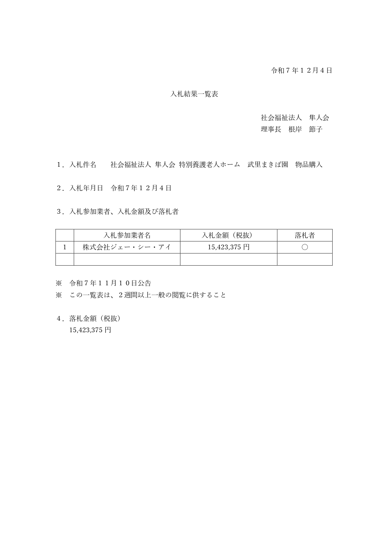 【公告】武里まきば園 見守り支援介護ロボット 入札結果一覧表